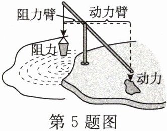 5. [浙教八下 P139T5]一杠杆装置如图,杆的一端吊起一桶水,所受的重力为 $ 250\ N $,木桶对杆的拉力的作用点到支点的杆长为 $ 1.2\ m $.杆与水平线的倾斜角为 $ 45^{\circ} $.设在杆的另一端施加的压力为 $ p(N) $,压力作用点到支点的距离为 $ d(m) $(杆自身所受的重力略去不计).
