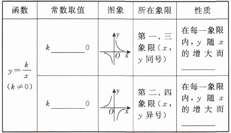 (2)在反比例函数 $ y = \frac{k}{x} $ 中,比例系数 $ k \neq 0 $,自变量 $ x \neq 0 $,函数值 $ y \neq 0 $.另外两种表达形式为 $ y = kx^{-1} $ 或 $ xy = k(k \neq 0) $.