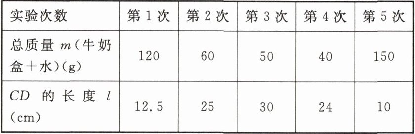 关系(填“一次函数”“反比例函数”或“二次函数”),求出 $ l $ 关于 $ m $ 的函数表达式.(3)某同学给空牛奶盒里加入了 $ 65\ g $ 的水,移动托盘使天平保持平衡,此时 $ CD = 20\ cm $,求这个空牛奶盒的质量.