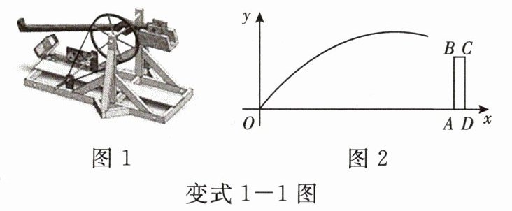 变式 1 - 1 [2025·衢州模拟]发石车(图 1)是古代一种攻城器械,据《三国志》记载:曹操创制发石车,攻破袁绍军壁楼. 如图 2,发石车位于点 $ O $ 处,其前方有一堵壁楼,其防御墙的竖直截面为矩形 $ ABCD $,墙宽 $ BC $ 为 2 米,点 $ A $ 与点 $ O $ 的水平距离为 28 米,墙高 $ AB $ 为 6 米. 以点 $ O $ 为原点,水平方向为 $ x $ 轴方向,建立直角坐标系,将石块视为一个点,其飞行路线近似为抛物线 $ y = a(x - 20)^2 + k $($ a \neq 0 $).