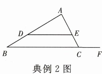 典例 2 [2023·杭州]如图,点 D,E 分别在△ABC 的边 AB,AC 上,且 DE//BC,点 F 在线段 BC 的延长线上.若∠ADE=28°,∠ACF=118°,则∠A=