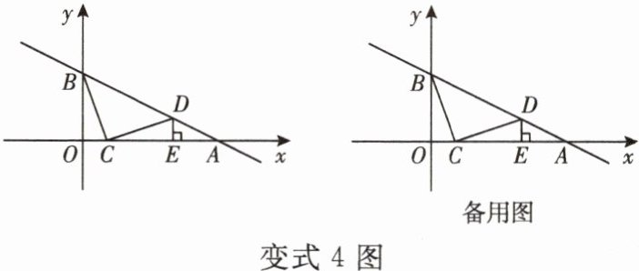 变式 4 [2025·台州模拟]如图,在平面直角坐标系中,直线 $y = -\frac{1}{2}x + 3$ 与 $x$ 轴、$y$ 轴相交于 $A$,$B$ 两点,动点 $C$ 在线段 $OA$ 上,将线段 $CB$ 绕着点 $C$ 顺时针旋转 $90^{\circ}$ 得到 $CD$,此时点 $D$ 恰好落在直线 $AB$ 上时,过点 $D$ 作 $DE\perp x$ 轴于点 $E$.