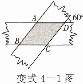 变式 4 - 1 [2024·广西]如图,两张宽度均为 $3\ cm$ 的纸条交叉叠放在一起,交叉形成的锐角为 $60^{\circ}$,则重合部分构成的四边形 $ABCD$ 的周长为 $$