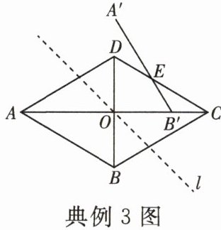 典例 3 [2024·浙江]如图,在菱形 $ABCD$ 中,对角线 $AC$,$BD$ 相交于点 $O$,$\frac{AC}{BD} = \frac{5}{3}$。线段 $AB$ 与 $A'B'$ 关于过点 $O$ 的直线 $l$ 对称,点 $B$ 的对应点 $B'$ 在线段 $OC$ 上,$A'B'$ 交 $CD$ 于点 $E$,则 $\triangle B'CE$ 与四边形 $OB'ED$ 的面积比为