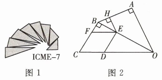 变式 3 - 2 [2023·温州]图 1 是第七届国际数学教育大会(ICME - 7)的会徽,图 2 由其主体图案中相邻两个直角三角形组合而成。作菱形 $CDEF$,使点 $D$,$E$,$F$ 分别在边 $OC$,$OB$,$BC$ 上,过点 $E$ 作 $EH \perp AB$ 于点 $H$。当 $AB = BC$,$\angle BOC = 30^{\circ}$,$DE = 2$ 时,$EH$ 的长为(