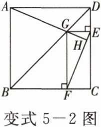 变式 5 - 2 [2023·绍兴]如图,在正方形 $ABCD$ 中,$G$ 是对角线 $BD$ 上的一点(与点 $B$,$D$ 不重合),$GE \perp CD$,$GF \perp BC$,$E$,$F$ 分别为垂足,连结 $EF$,连结 $AG$ 并延长交 $EF$ 于点 $H$。
