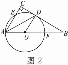题系 如图 2,在$\triangle ABC$中,$\angle C = 90^{\circ}$,$D$为$BC$上的一点,$AD$平分$\angle BAC$,以点$O$为圆心,$OA$为半径的圆恰好经过点$D$,并分别交$AC$,$AB$于点$E$,$F$,连结$OD$。