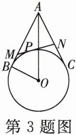 3. [浙教九下 P48T5 改编]已知:如图,$A$是$\odot O$外一点,$AB$,$AC$分别与$\odot O$相切于点$B$,$C$。$P$是$\overset{\frown}{BC}$上任意一点,过点$P$作$\odot O$的切线,交$AB$于点$M$,交$AC$于点$N$。若$AO = 2$,$BO = 1$,则$\triangle AMN$的周长为