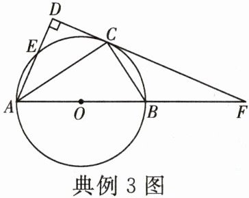 典例 3 [通过平行证垂直]如图,$AB$是$\odot O$的直径,点$E$,$C$在$\odot O$上,$C$是$\overset{\frown}{BE}$的中点,$AE$垂直于过点$C$的直线,垂足为$D$,$AB$的延长线交直线$DC$于点$F$。求证:$DC$是$\odot O$的切线。