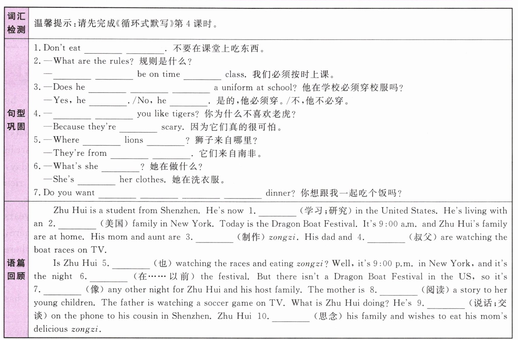 句型巩固 1.in class 2.We must; for 3.have to wear; does; doesn't 4.Why don't; really 5.are; from; South Africa 6.doing; washing 7.to join me for 语篇回顾 1.studying 2.American 3.making 4.uncle 5.also 6.before 7.like 8.reading 9.talking 10.misses