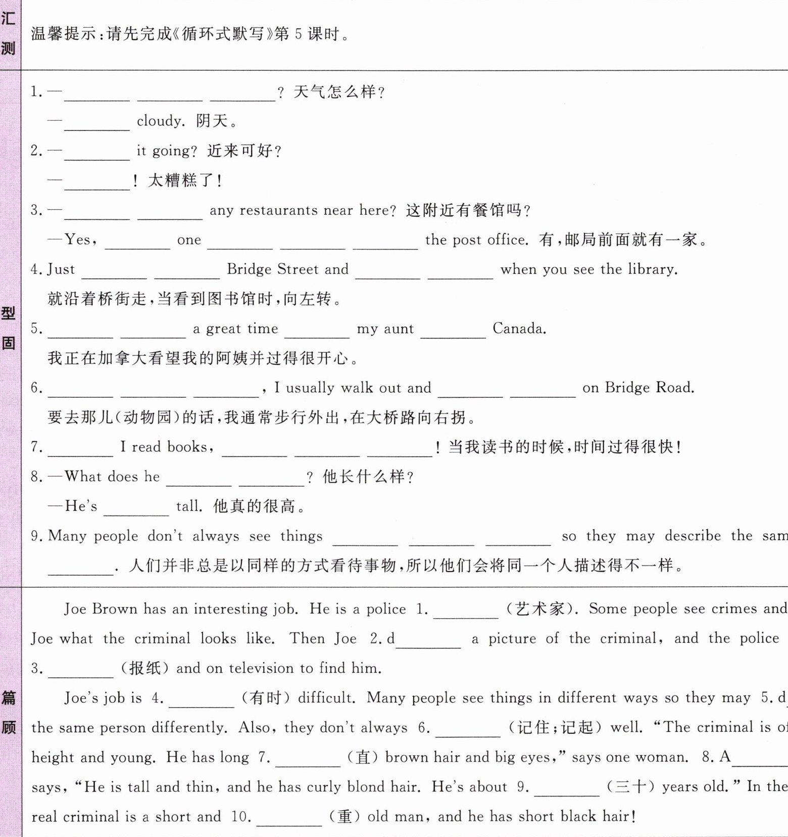 1.How’s the weather;It’s 2. How’s;Terrible 3. Are there;there’s;in front of 4. go/walk along/down;turn left 5. I’m having;visiting;in 6. To get there;turn right 7. When;time goes quickly 8. look like;really 9. the same way;differently 1.artist 2. draws 3. newspapers 4. sometimes 5. describe 6. remember 7. straight 8. Another 9. thirty 10. heavy