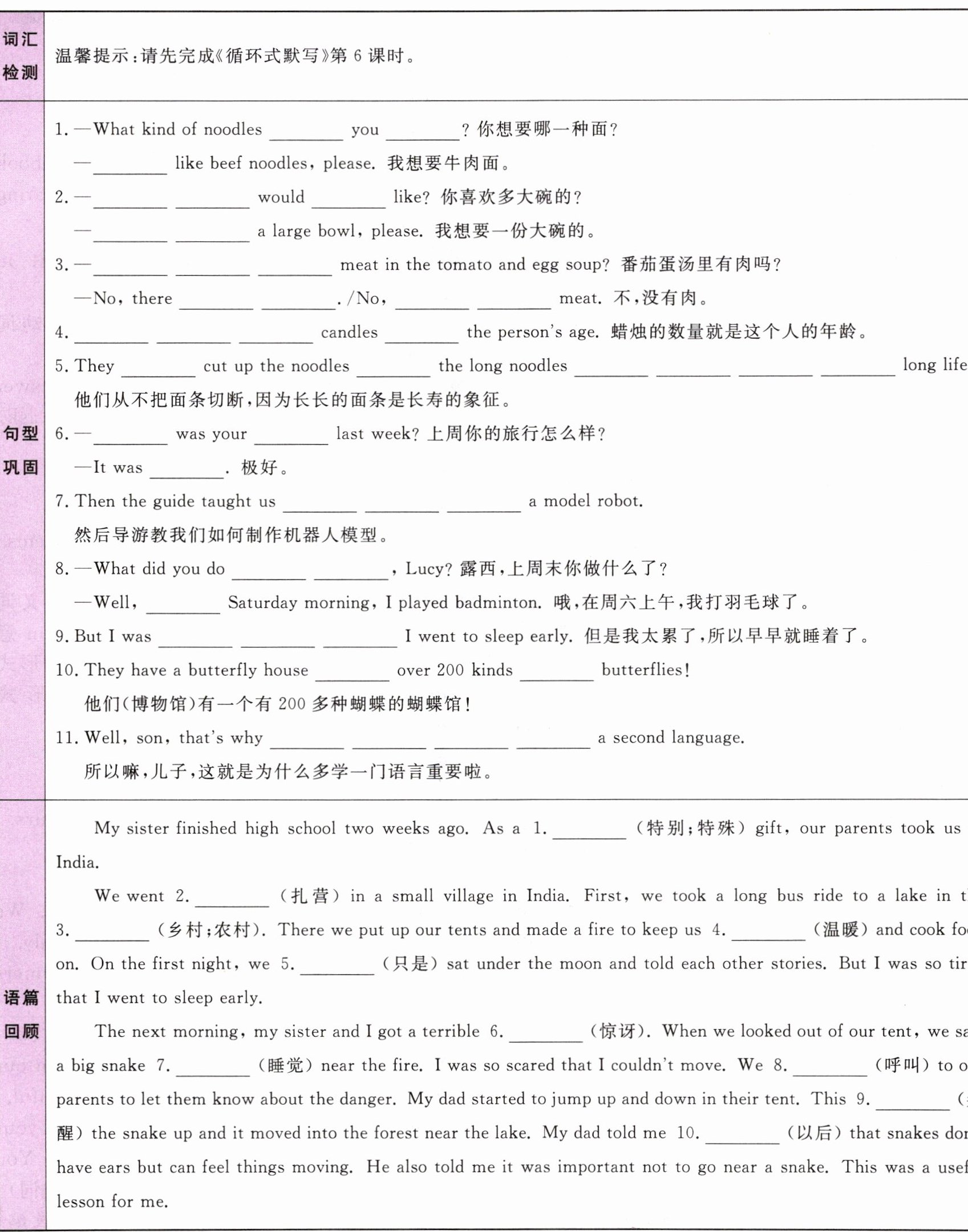 1.I'd like 2.What size;you;I'd like 3.Is there any;isn't any;there's no 4.The number of;is 5.never;because;are a symbol of 6.How;trip;excellent/wonderful/fantastic/great 7.how to make 8.last weekend;on 9.so tired that 10.with;of 11.it's important to learn 语篇回顾 2.camping 3.countryside 4.warm 5.just/simply