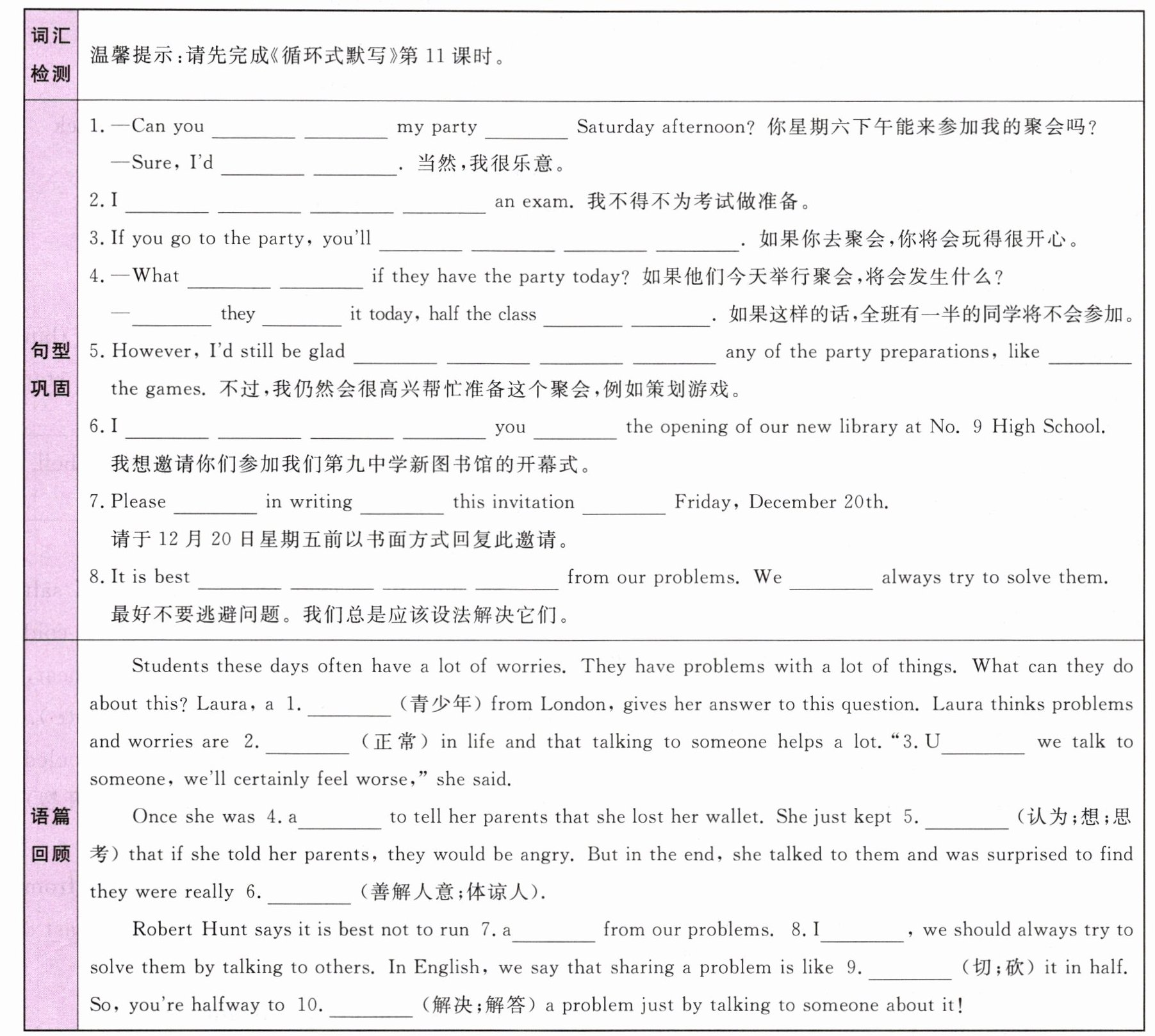 句型巩固 1.come to;on;love to 2.have to prepare for 3.have a great time 4.will happen;If;have;won't come 5.to help out with;planning 6.would like to invite;to 7.reply;to;by 8.not to run away;should 语篇回顾 1.teenager 2.normal 3.Unless 4.afraid 5.thinking 6.understanding 7.away 8.Instead 9.cutting 10.solving