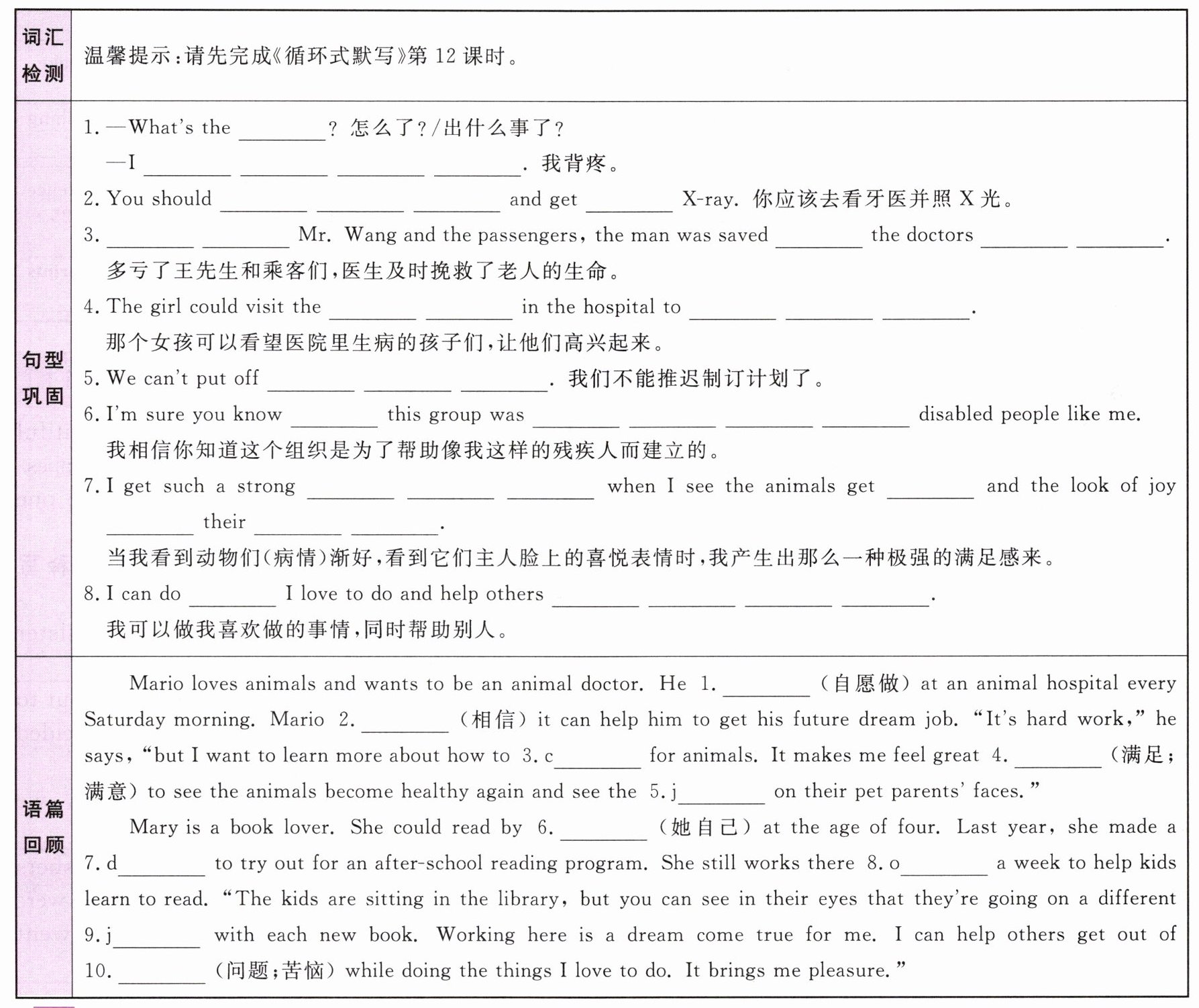 1.matter/trouble/problem; have a sore back 2. see a dentist; an 3.Thanks to; by; in time 4.sick kids/children; cheer them up 5.making a plan 6.that; set up to help 7.feeling of satisfaction; better; on; owners’ faces
