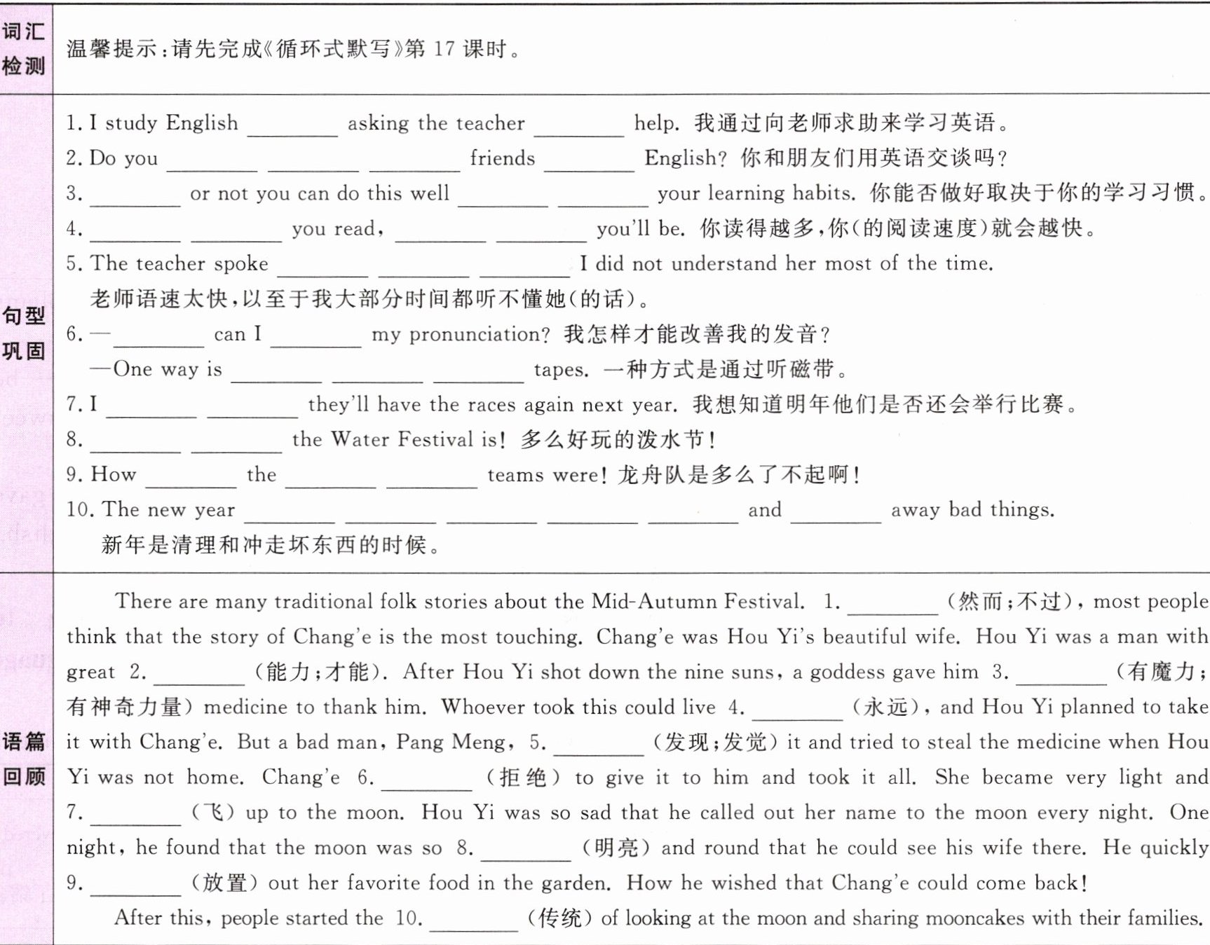 句型巩固 1.by;for 2.have conversations with;in 3.Whether;depends on 4.The more;the faster 5.so quickly/fast that 6.How;improve;by listening to 7.wonder if/whether 8.What fun 9.fantastic;dragon boat 10.is a time for cleaning;washing 语篇回顾 1.However 2.ability/abilities 3.magic 4.forever 5.discovered/found 6.refused 7.flew 8.bright 9.laid 10.tradition(s)