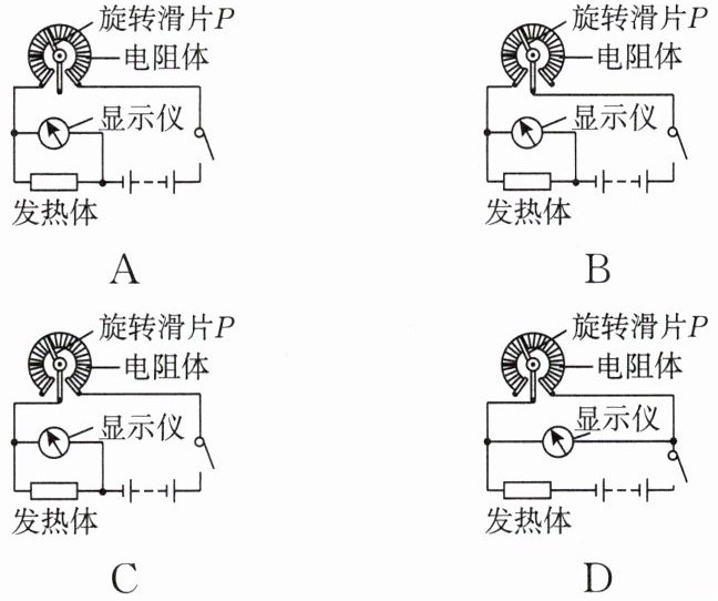 典例 3 [2023·绍兴]科学兴趣小组开展“制作可调式电热水壶”的活动。设计电路时要求满足:闭合开关后,顺时针调节变阻器的旋钮滑片 P 时,通过发热体的电流增大,产热加快;同时反映发热体功率高低的显示仪(电压表)示数增大。下列设计符合要求的是( )