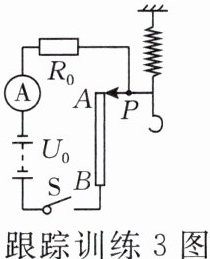 跟踪训练 3 如图所示是某项目小组制作的一台“电子秤”的电路模型,已知 U₀ = 6V,R₀ = 10Ω,AB 是一根粗细均匀、长为 20cm 且总阻值为 10Ω 的电阻丝。未测量时滑片 P 刚好处在 A 端,测量时将被测物体挂在挂钩上。