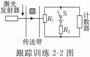跟踪训练 2 - 2 某科技小组为快递公司设计的分拣计数装置简化电路如图所示。R₂ 为定值电阻,R₁ 为光敏电阻,当有光照射光敏电阻时其阻值变小。激光被遮挡一次,计数器会自动计数一次(计数器可视为电压表)。某一时刻,闭合开关,激光被遮挡的瞬间,通过 R₂ 的电流将__________(选填“变大”“变小”或“不变”,下同);电阻 R₁ 两端的电压将__________。