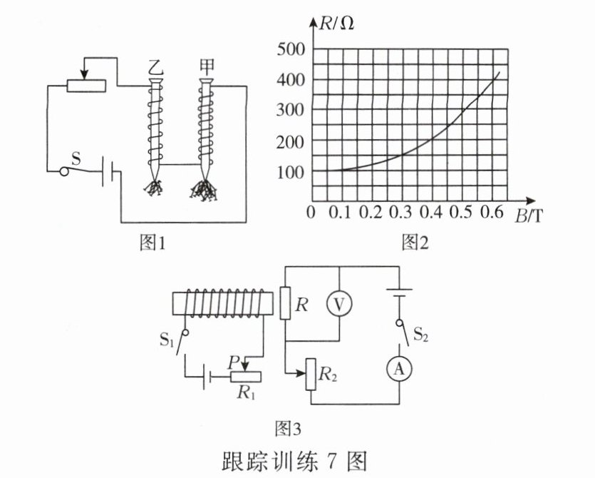 跟踪训练7 [2025·陕西西安]在探究“电磁铁磁性强弱的影响因素”实验中,小乐同学利用电源、开关、滑动变阻器、两根完全相同的铁钉、表面绝缘的铜线、大头针若干,制成简易电磁铁甲、乙,并设计了如图1所示的电路。