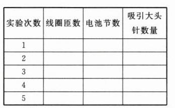 ①用细线把3枚铁钉捆绑在一起,再用长导线缠绕铁钉6圈,连接在1节全新干电池两端(如图所示),制成简易的电磁铁。用电磁铁尖端去靠近大头针,观察吸引大头针的数目(通电时间不超过10s,下同)。