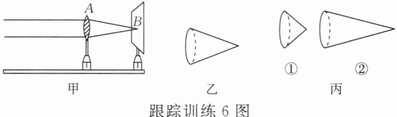跟踪训练 6 [2024·宁波模拟]小科在光具座上用凸透镜、光屏等模拟人眼成像过程:如图甲所示,将圆柱状光束自左向右射向凸透镜 A,以模拟自然光射入晶状体的过程;光束透过凸透镜 A 后落在光屏 B 处,形成如图乙所示的圆锥状顶点模拟物像。