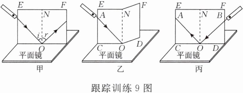 跟踪训练 9 图甲是研究光的反射定律的实验,平面镜放在水平桌面上,E、F 是两块可绕 ON 自由转动的光屏。