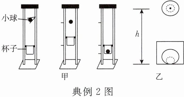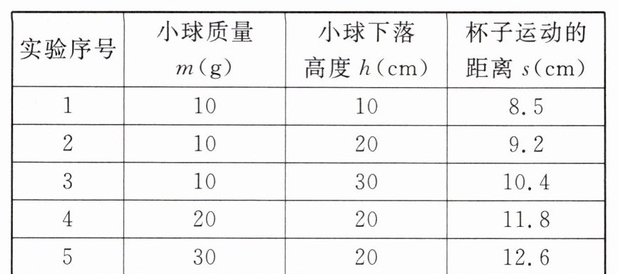(1)【实验设计】为了验证猜想设计了如图甲所示的实验装置。将不同小球从装置的一定高度自由释放,利用夹子标记球和杯子的位置,测量小球下落高度 $ h $(如图乙所示)和杯子运动的距离 $ s $,数据记录如表所示。该实验物体的势能大小是通过记录数据中________来反映的。