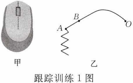 如图甲所示,鼠标的左键可看成杠杆 $ OBA $($ O $ 为支点),当我们的手指在 $ B $ 点按下鼠标左键时, $ A $ 端向下移动并按压其下方的金属弹片,使电路接通完成操作任务。