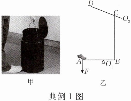 如图甲所示是脚踏式翻盖垃圾桶的实物图,可简化为图乙,当脚竖直向下用力 $ F $ 踩下 $ A $ 点位置时,杆 $ AO_{1}B $ 绕支点 $ O_{1} $ 转动, $ BC $ 杆被带动, $ C $ 点受力,使看作杆 $ O_{2}CD $ 的盖子绕 $ O_{2} $ 转动,盖子被翻开。此时杆 $ AO_{1}B $ 与地面平行并静止,杆 $ AO_{1}B $ 和 $ O_{2}CD $ 均看作质量均匀分布的杠杆。