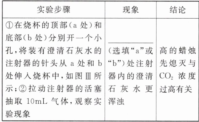 (3)乙同学对甲同学的结论表示怀疑,于是他利用气体浓度传感器测量烧杯内两支蜡烛从点燃前到全部熄灭后,烧杯 a 处二氧化碳的浓度变化,测量结果如图Ⅳ所示。他又用集气瓶收集一瓶含 80%CO₂、20%O₂的混合气体,将燃着的蜡烛伸入集气瓶中,观察到蜡烛能在混合气体中继续燃烧。根据上述实验现象你能获得的结论是______。