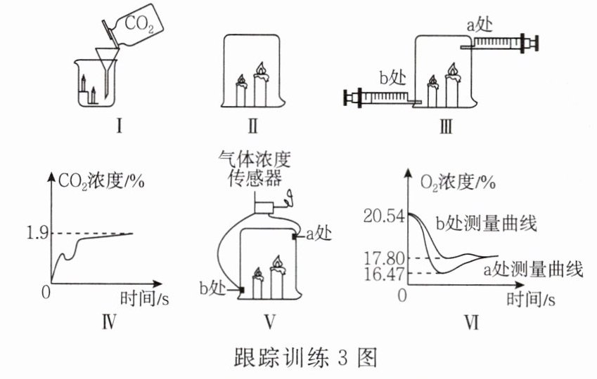 跟踪训练 3 某老师在实验室做了一个有趣的高低蜡烛实验:将二氧化碳气体慢慢倒入装有两支高低不同燃着的蜡烛的烧杯中,如图Ⅰ所示。