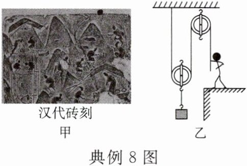 典例8 [2025·四川遂宁]我国很早就有使用滑轮的记载,如图甲的汉代砖刻便记录了矿山使用滑轮作起吊机械的场景。借助如图乙所示的装置(篮子质量不计),质量为 $ 60kg $ 的采矿工人用 $ 400N $ 的拉力将 $ 70kg $ 的矿石从矿坑匀速提起,$ 10s $ 内矿石上升了 $ 2m $。(忽略绳重及滑轮的摩擦,$ g $ 取 $ 10N/kg $)求: