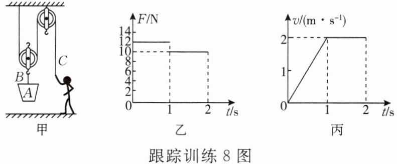 (2)由图丙可知,第2s内A上升的速度$v_{A}=2m/s,$拉力端移动速度$v=2v_{A}=2×2m/s=4m/s,$则1~2s内拉力F的功率P=frac{W}{t}=frac{Fs}{t}=Fv=10N×4m/s=40W。