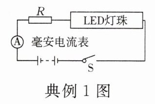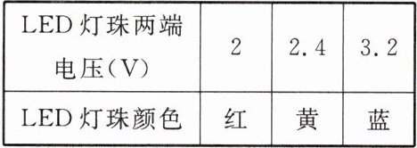 典例 1 [2024·山海联盟模拟]“数控草坪”是杭州第 19 届亚运会闭幕式的亮点之一,通过埋设四万多个 LED 灯珠,从而变幻出不同的图案。LED 灯珠由 2 个发光二极管并联组成,每个发光二极管正常工作时的电流均为 $30mA$。如图所示是 LED 灯珠与 $50Ω$ 的定值电阻 $R$ 串联,如表所示是 LED 灯珠发光的颜色随其两端电压的变化而变化的情况。当电源电压为 $4.2V$ 时,闭合开关 $S$,电路中的电流为 $20mA$,此时 LED 灯( )