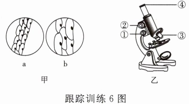 跟踪训练 6 小明在用显微镜观察洋葱表皮细胞临时装片的过程中,观察到图甲中 a、b 两个视野,要把视野中的物像从 a 转为 b,则小明除移动装片外还需调节图乙中的结构是( )