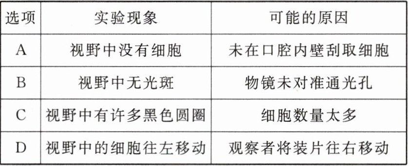 典例 6 [杭州中考]用显微镜观察经染色的人体口腔上皮细胞临时装片,观察到的实验现象与原因分析不吻合的一项是( )
