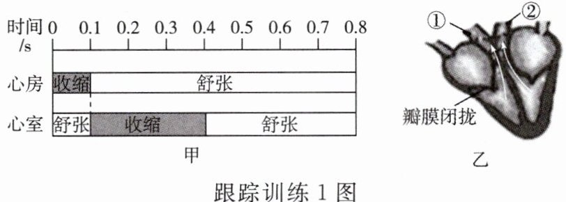 跟踪训练 1 如图所示,图甲为某人的心房、心室舒缩时间的关系图,图乙为某一瞬间心脏内瓣膜的状态图。下列描述正确的是( )