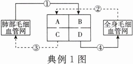 典例 1 [2024·四川南充改编]如图所示为人体血液循环简图,其中 A~D 表示心脏的四个腔,①~④表示血管。下列说法正确的是( )