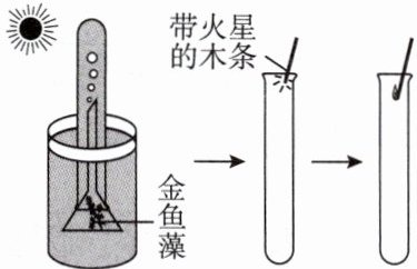 实验操作:把此装置放在阳光下30min后,会看到金鱼藻上冒出许多气泡,当气体充满试管时,从水中取出,将带火星的木条迅速插入试管中,发现木条复燃。已知氧气有助燃的特性。