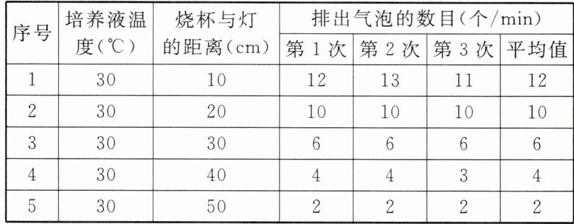 ②开启并移动LED灯,使光源与烧杯间距为10cm,待产生稳定气泡后数出黑藻1min内排出气泡的数目,共3次。