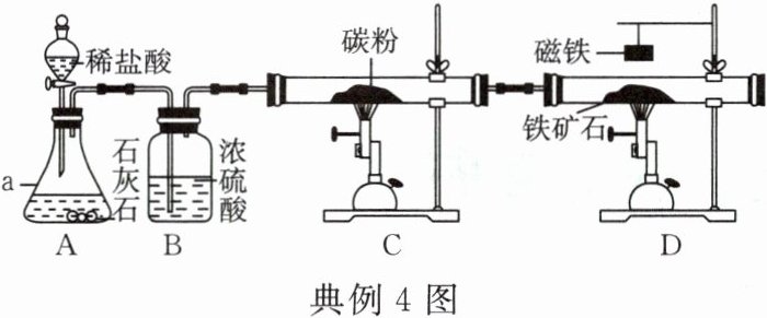 典例 4 [2024·杭州滨江区一模]小滨利用如图所示器材(气密性良好)和试剂搭建了一套“模拟炼铁”的冶炼装置(铁矿石的主要成分为 Fe₂O₃)。