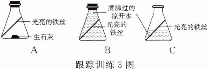 跟踪训练 3 [2023·宁波]室外的铁制栏杆在多雨季节易生锈,小宁对铁生锈的条件进行了探索,实验装置如图所示。3 天后,发现只有装置 C 中的铁丝生锈了。