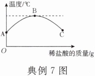 典例 7 室温下,将稀盐酸慢慢滴入装有氢氧化钠溶液的烧杯中,利用温度计测出烧杯中溶液的温度,溶液温度随加入稀盐酸的质量而变化的曲线如图所示: