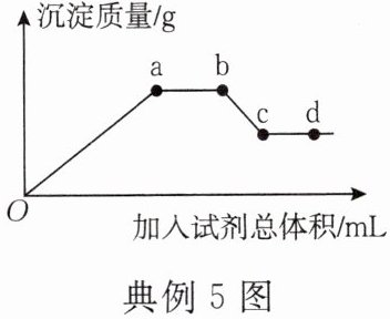 典例 5 [2024·陕西安康石泉县模拟]某蓝色溶液可能含有 CuSO₄ 和 CuCl₂ 中的一种或两种,为探究溶质成分,先滴入 Ba(OH)₂ 溶液,之后滴入稀盐酸,所得沉淀的质量随加入试剂总体积的变化趋势如图所示。下列说法中不正确的是( )