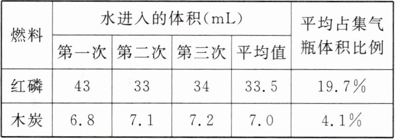 (3)红磷作为燃料时第一次实验数据有误,因为第一次实验数据远大于第二、三次的(或第一次实验时可能止水夹没夹紧,导致空气外逸,测量数据偏大)