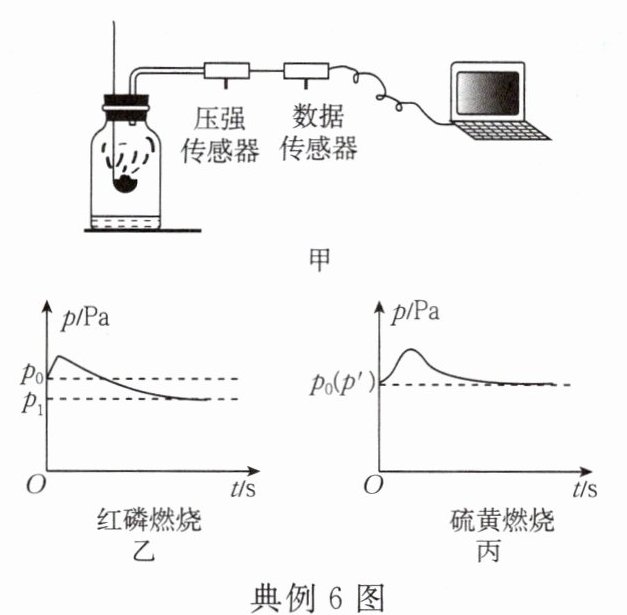 用图甲所示装置测定空气中氧气的含量,其中与集气瓶相连的压强传感器等电子设备能将集气瓶内气体压强精确地记录并保存下来。图乙、图丙是用该装置测得的红磷和硫黄分别在集气瓶中燃烧的 p-t 关系图(该装置气密性良好,p₀是集气瓶内初始气压,p₁和 p'分别是反应结束后恢复到室温时集气瓶内的气压)。下列说法中,正确的是( )