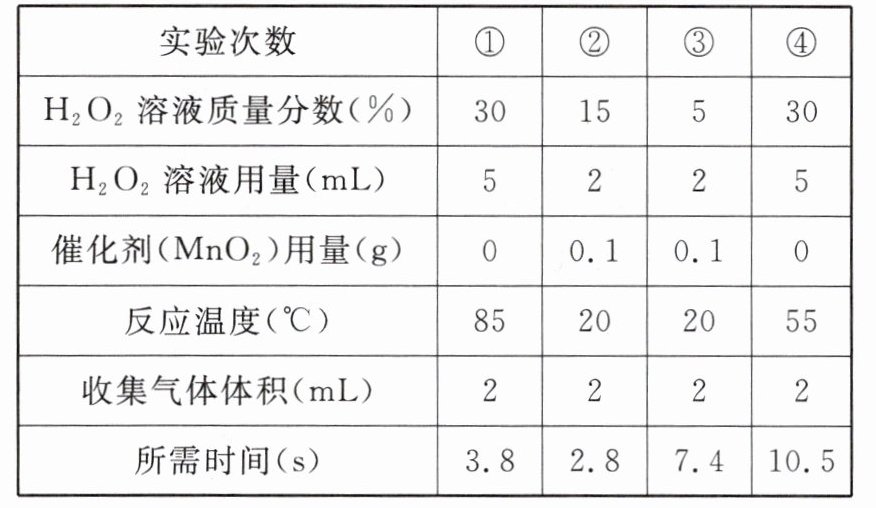 [2025·杭州校级模拟]某兴趣小组在学习了双氧水分解制取氧气的实验后,知道催化剂(MnO₂)能改变化学反应速率,到底还有哪些因素会影响化学反应速率呢?他们设计并进行了如表所示的四次实验。