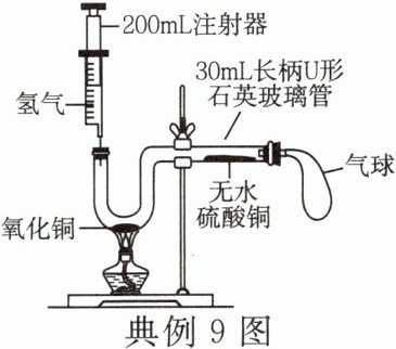 典例 9 [杭州中考]小科为了探究氧化铜与氢气的反应和反应产物,用如图所示装置进行实验。注射器内装有氢气,并将注射器针头扎入橡皮塞中。将少量氧化铜粉末送入长柄 U 形石英玻璃管内并平铺于管底。将少量白色的无水硫酸铜粉末送入长柄 U 形石英玻璃管中并平铺于直管中部。然后将一个气球套在长柄 U 形石英玻璃管的直管出口处,连接好整个实验装置并检查装置气密性……