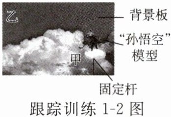 跟踪训练 1-2 [2023·宁波]如图所示是模拟孙悟空“腾云驾雾”的拍摄装置,该装置主要由“孙悟空”模型和“蓝天白云”背景板组成。为了让“孙悟空”从背景板的甲处移到乙处,一般有两种方式:第一种是背景板相对于地面静止,移动“孙悟空”;第二种方式是“孙悟空”相对于地面静止,移动背景板。如果采用第二种方式,背景板按下列方向移动可以实现的是 ( )