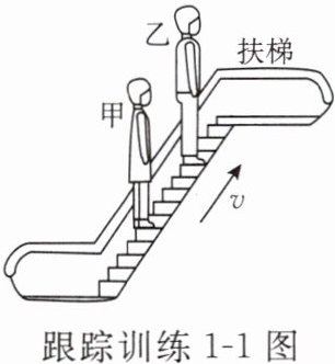 跟踪训练 1-1 [2025·嘉兴一模]如图所示,甲、乙两人站在上行的自动扶梯上,以扶梯为参照物,下列分析正确的是 ( )